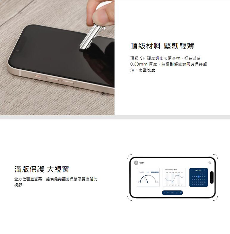9H 硬度鋼化玻璃材質提供滿版保護,兼容市面上幾乎所有的保護殼