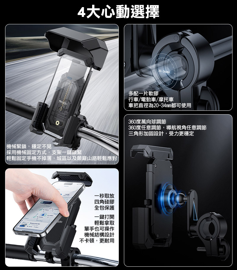 適用有橫桿的機車或自行車:適用管徑 20-34mm、適用手機 4.7-6.8吋手機