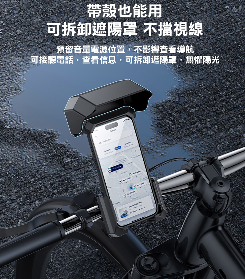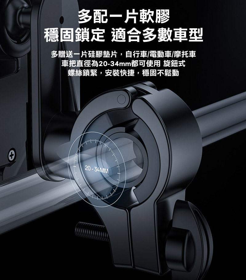 ※適用手機尺寸:適用有橫桿的機車或自行車:適用管徑 20-34mm、適用手機 4.7-6.8吋手機
