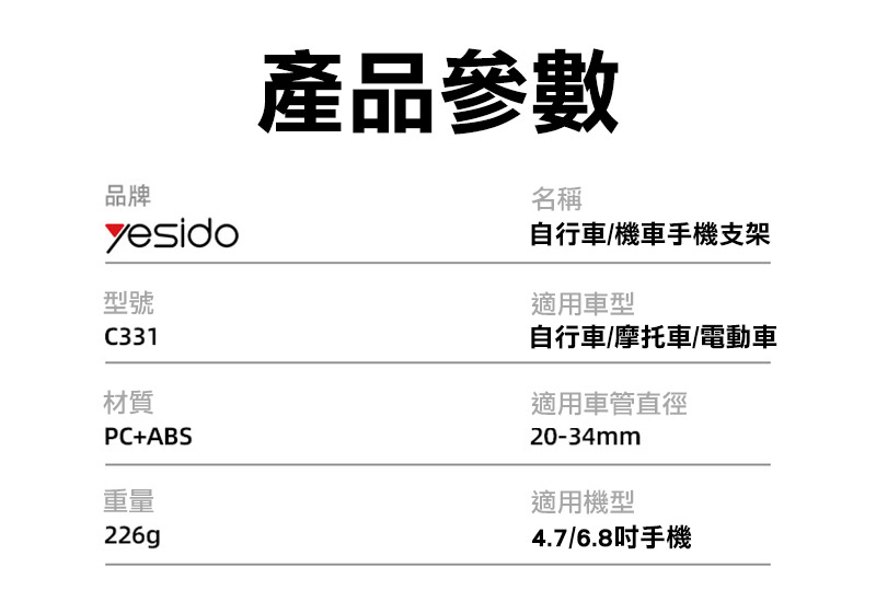 .內容物:C331 自行車/機車手機支架*1、額外軟膠墊*1