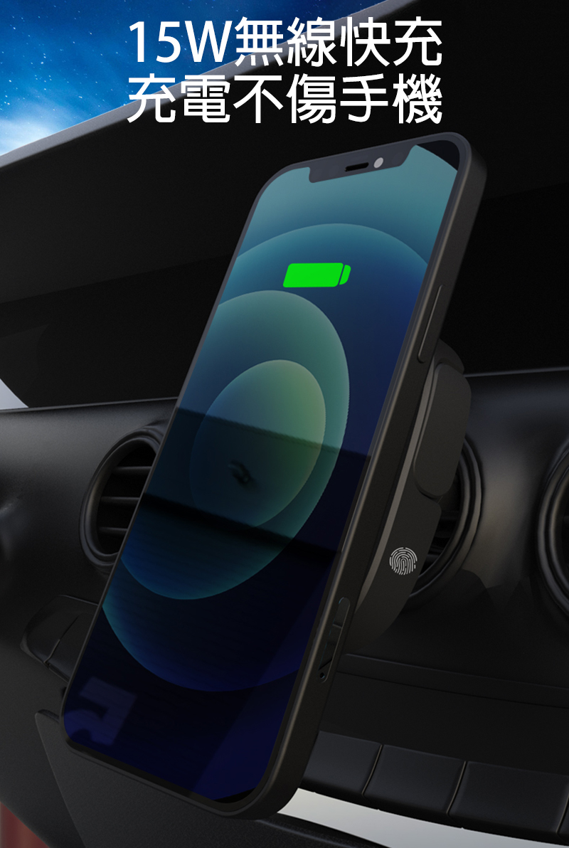 ※無 MagSafe 功能手機,請先觸碰開關啟用夾臂,偵測到充電,夾臂會自動夾緊