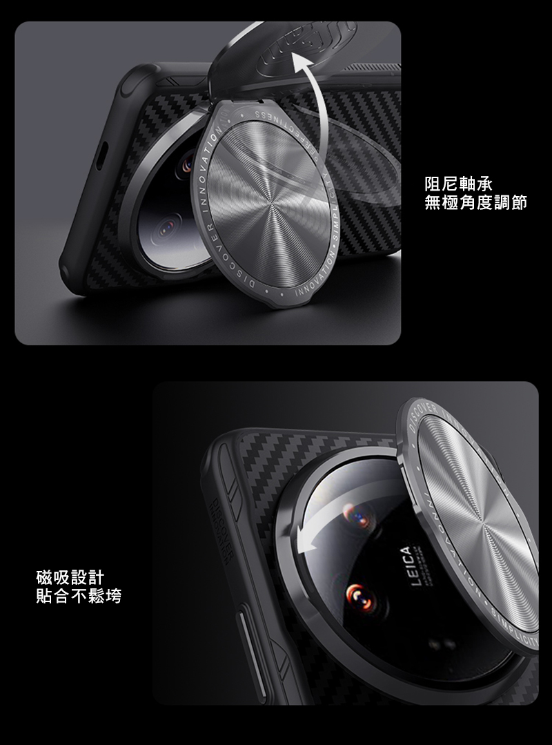 - 磁吸金屬鏡框支架設計,開合更輕鬆,兼顧鏡頭保護和手機支撐功能