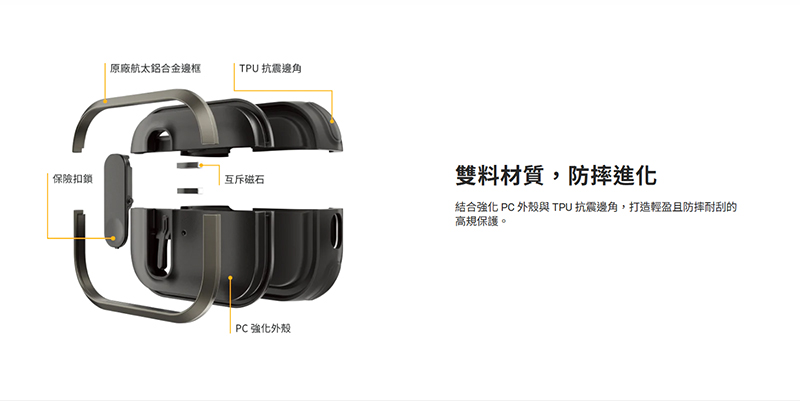 ※商品特色.獨家保險扣鎖設計,能緊密鎖牢耳機殼主體,僅在按壓扣鎖下方才能開蓋,防止耳機在日常使用意外丟失.採用互斥磁石技術,按壓自動彈開,提供更流暢的使用體驗。.隨附 3M 貼條,無須擔心殘膠,提供上蓋牢固貼合、避免鬆脫掉落。.Apple 原廠同級航太鋁合金邊框,透過頂級工藝打造質感細節。.無需拆殼,時刻保持最佳電力狀態.獨家可拆式掛耳、掛孔,隨心搭配附贈配件,解鎖更多使用情境