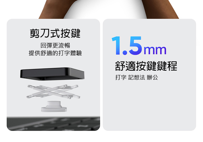 .剪刀式結構按鍵,回彈更流暢,1.5mm 鍵程,手感絕佳