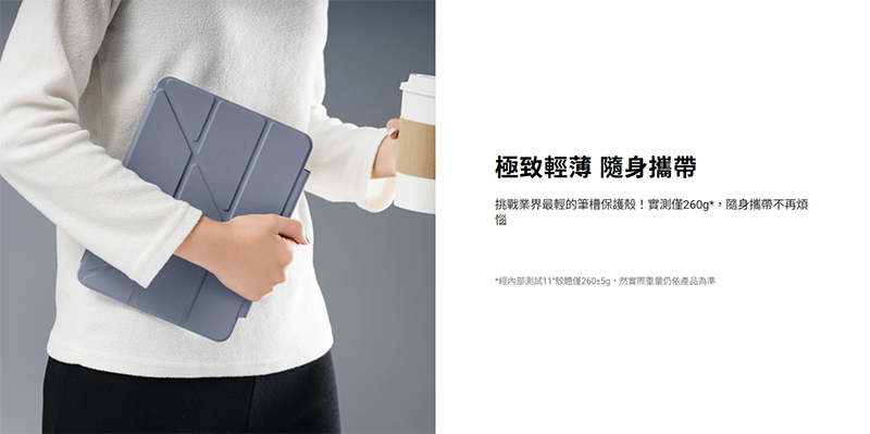 挑戰業界最輕的筆槽保護殼!實測僅260g,隨身攜帶不再煩惱 ( * 經內部測試11"殼體僅260±5g,然實際重量仍依產品為準 )