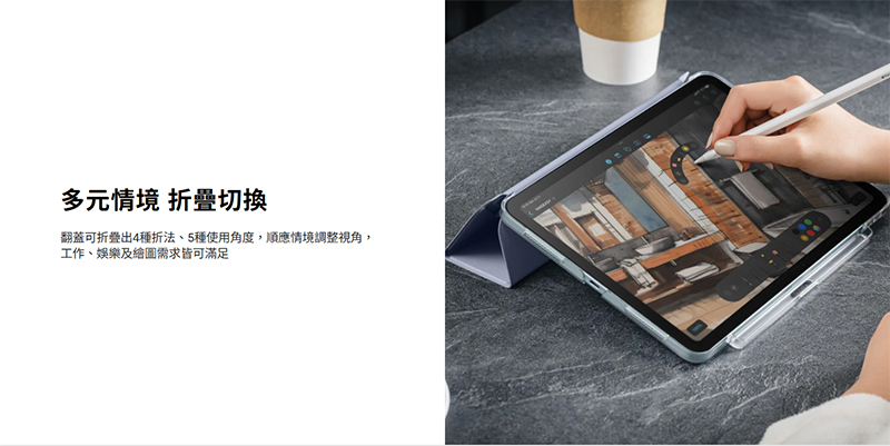 翻蓋可折疊出4種折法、5種使用角度,順應情境調整視角,工作、娛樂及繪圖需求皆可滿足