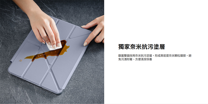 翻蓋雙面採用奈米抗污塗層,形成高密度奈米顆粒鍍膜,避免污漬附著、方便清潔保養