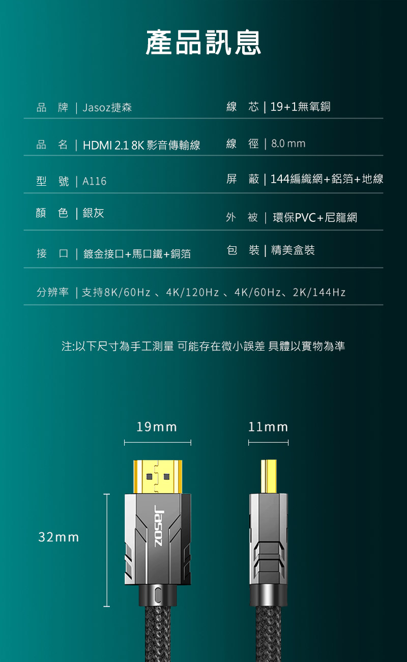 適用機型:使用 HDMI 連接之裝置商品材質:PVC+尼龍網提供顏色:銀灰色內容物:A116 HDMI 2.1 8K 影音傳輸線(1.5M)*1