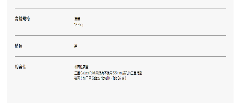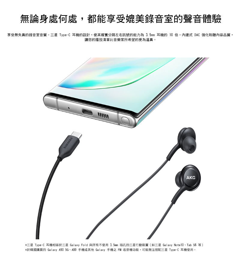 .相 容 性 :三星 Galaxy Fold 與所有不使用 3.5mm 插孔的三星行動裝置(如三星 Galaxy Note 10、Tab S6 等)