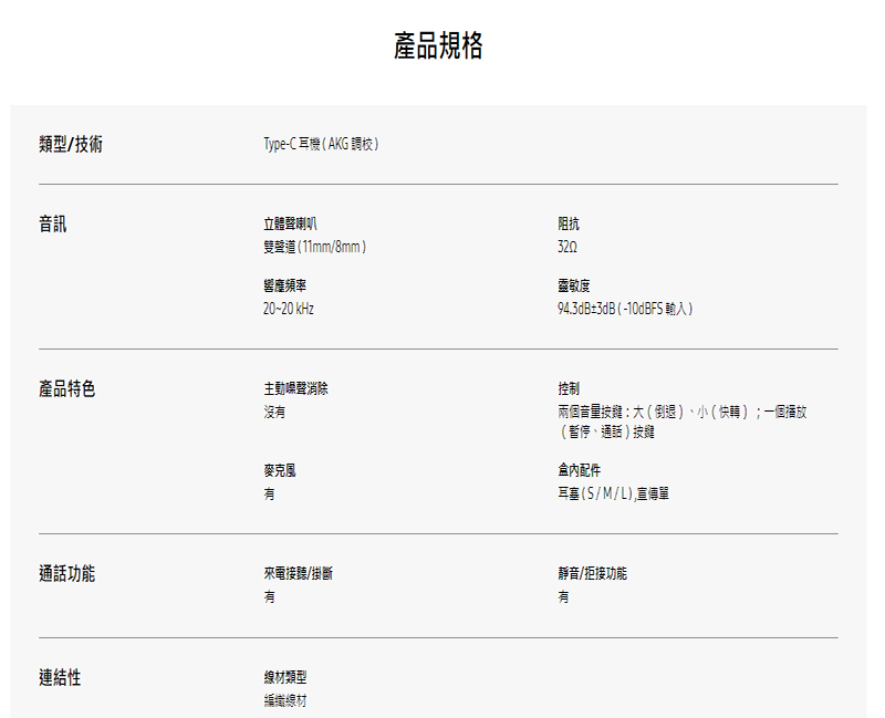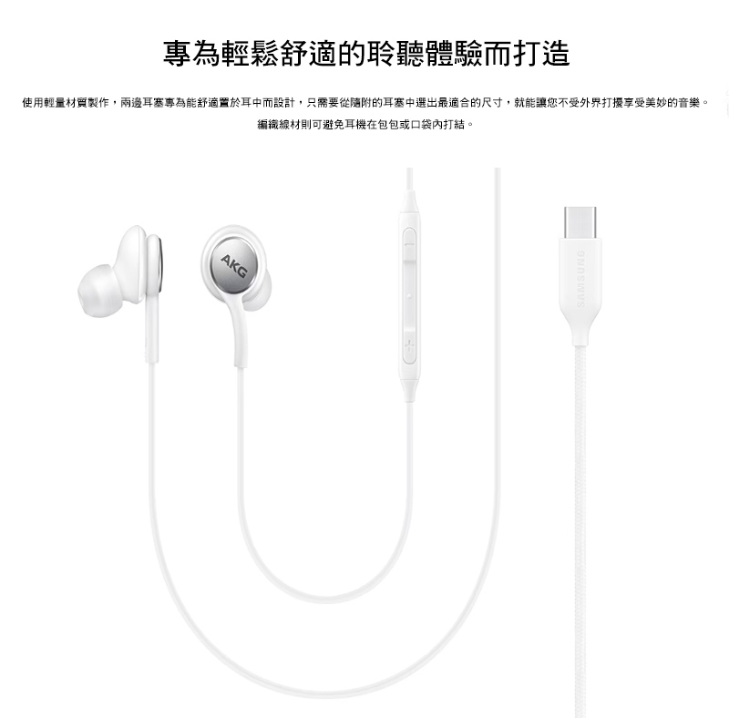 .內容物:SAMSUNG Type-C 線控耳機(AKG 調校)*1、耳塞(S/M/L)*1組