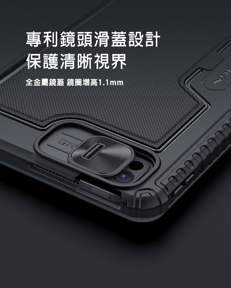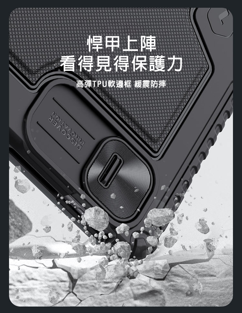 .強悍抗摔保護殼緊貼機身,搭配專利滑蓋鏡頭設計,為設備的正背面、四角和鏡頭提供可靠的保護