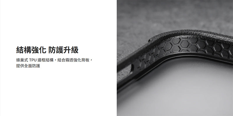 霧透強化背板、蜂巢式軟邊框結構,提供雙層保護