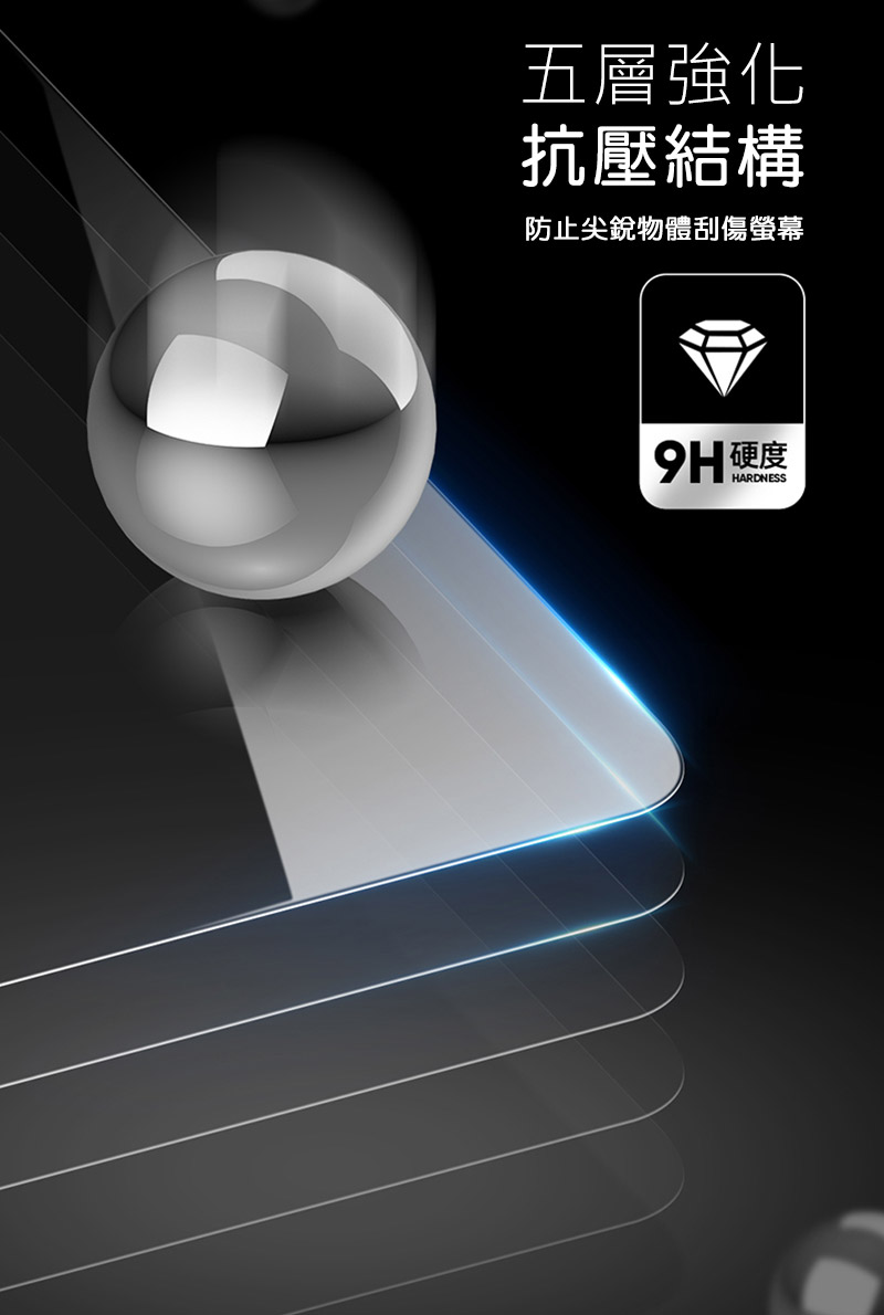 .五層強化,9H 硬度,抵擋尖銳物品劃傷螢幕