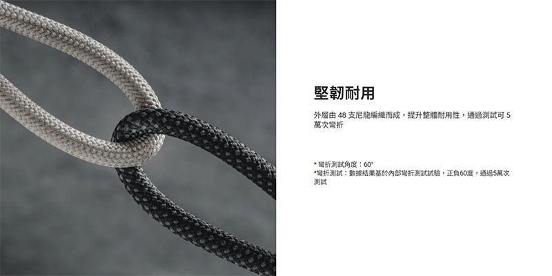 外層由 48 支尼龍編織而成,提升整體耐用性,通過測試可 5 萬次彎折 * 彎折測試角度:60°