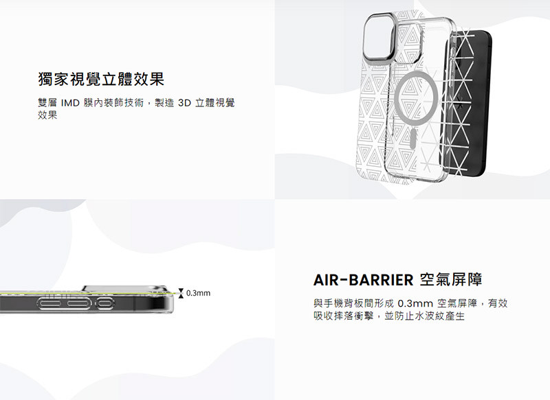 .AIR-BARRIER 空氣屏障,與手機背板間形成 0.3mm 空氣屏障,有效吸收摔落衝擊,並防止水波紋產生