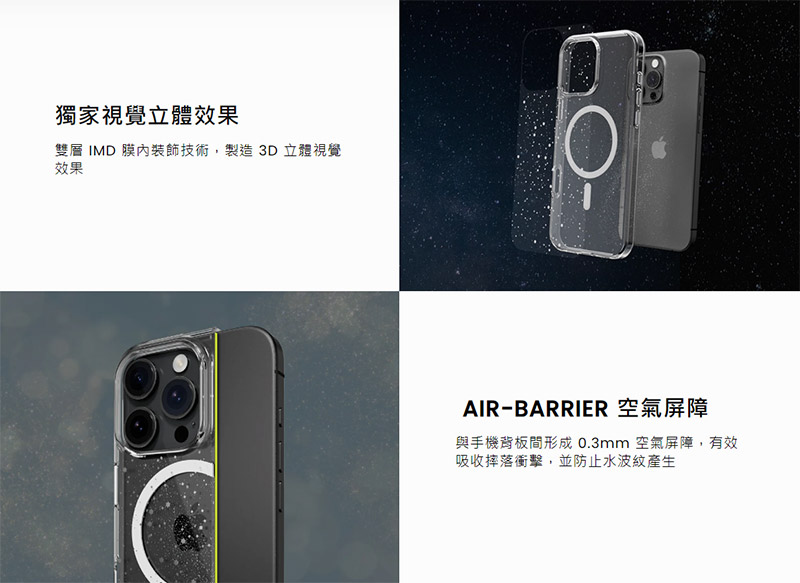 .AIR-BARRIER 空氣屏障,與手機背板間形成 0.3mm 空氣屏障,有效吸收摔落衝擊,並防止水波紋產生