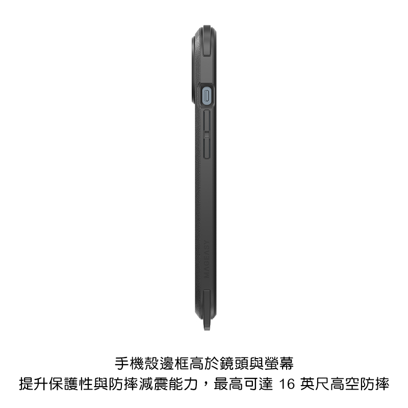 - 四角擊強化設計,邊角凸出 2mm,手機殼邊框高於鏡頭與螢幕,提升保護性與防摔減震能力,最高可達 16 英尺高空防摔