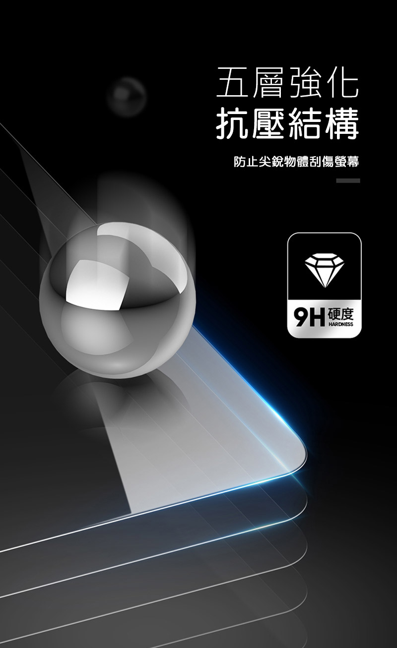 .五層強化,9H 硬度,抵擋尖銳物品劃傷螢幕
