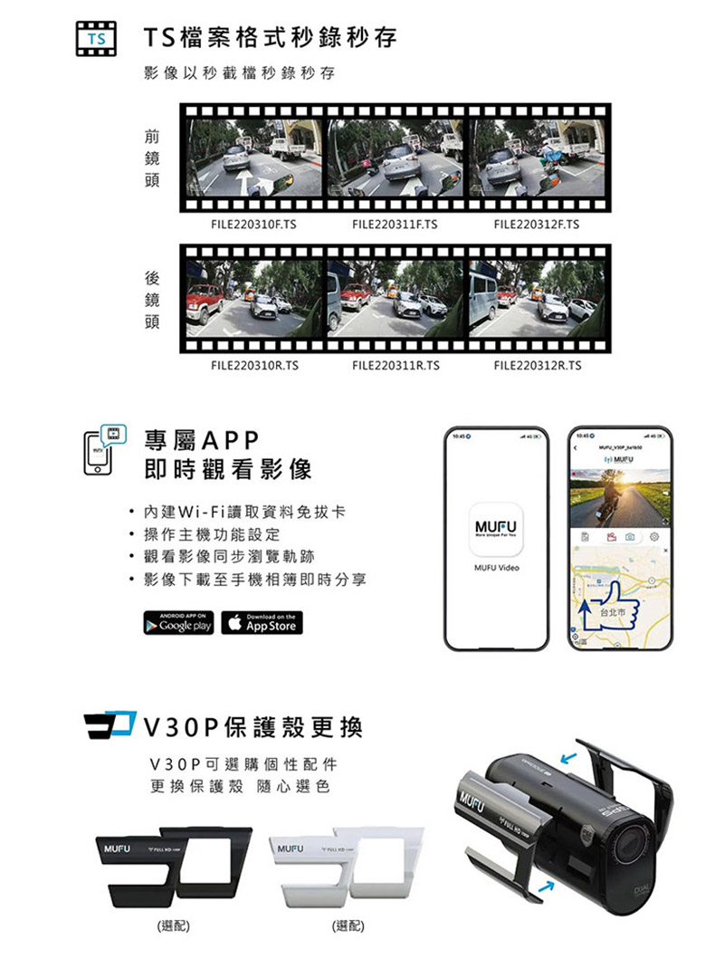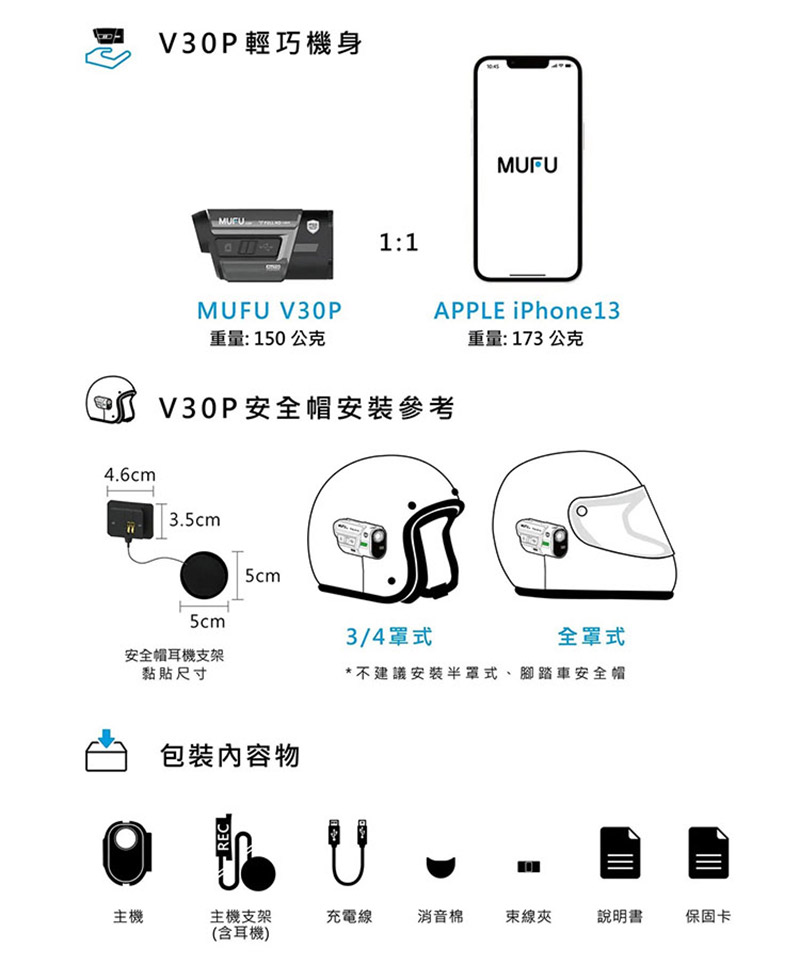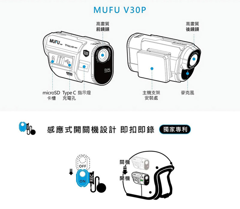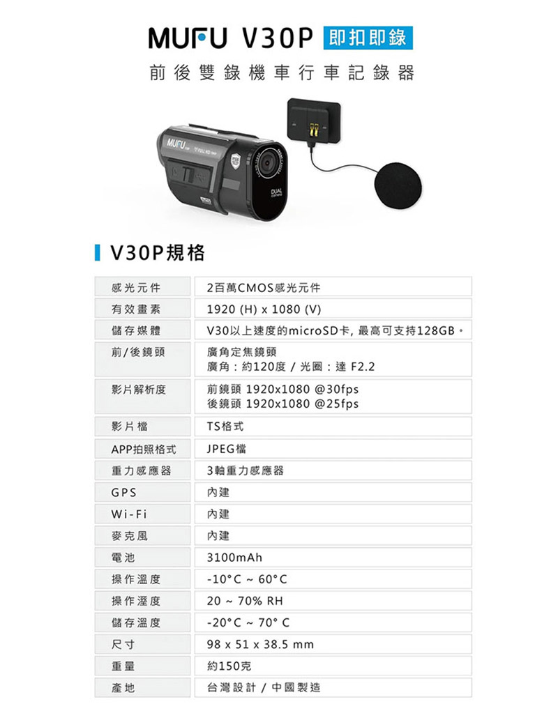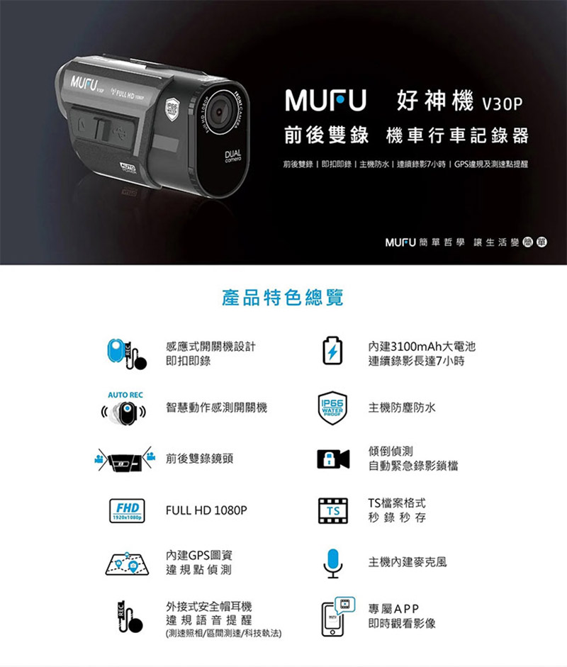 MUFU V30P 前後雙錄機車行車紀錄器-好神機 防水防塵 高畫質 Full HD 1080P 迷你輕巧 動作感應偵測 {{specImage.SkuName}}
