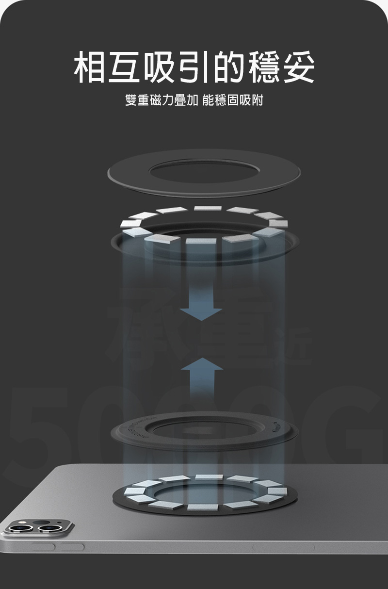 .內置12顆強力磁鐵,雙向磁力疊加,近5000g承重,大尺寸平板也能穩固支撐