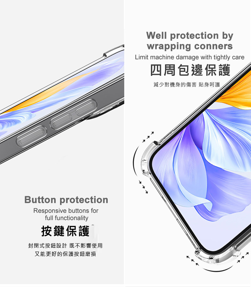- 直邊邊框,四角凸起防摔保護,彈性緩衝