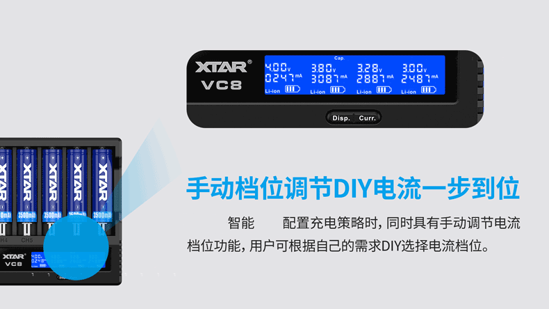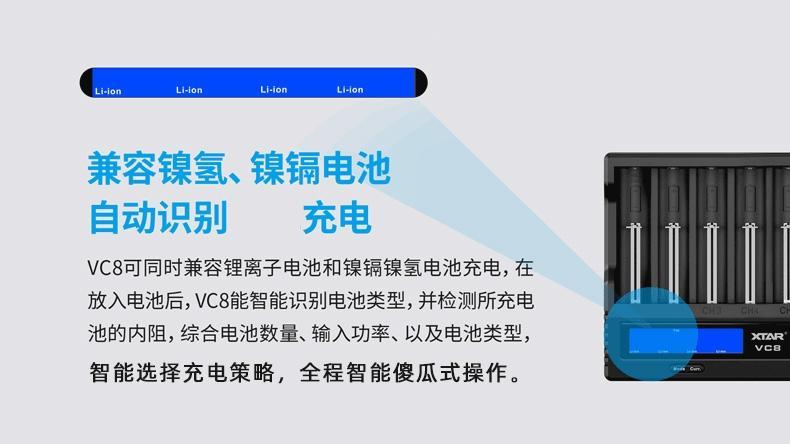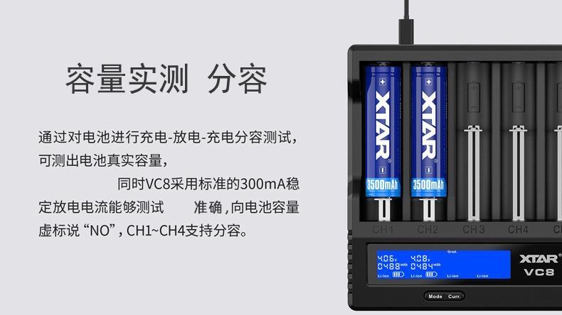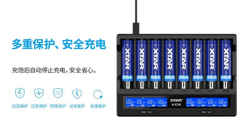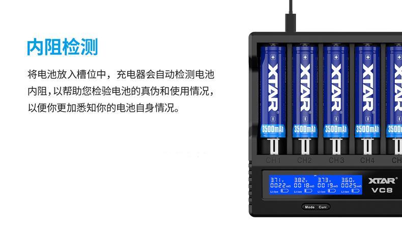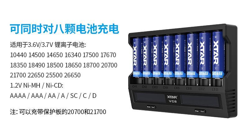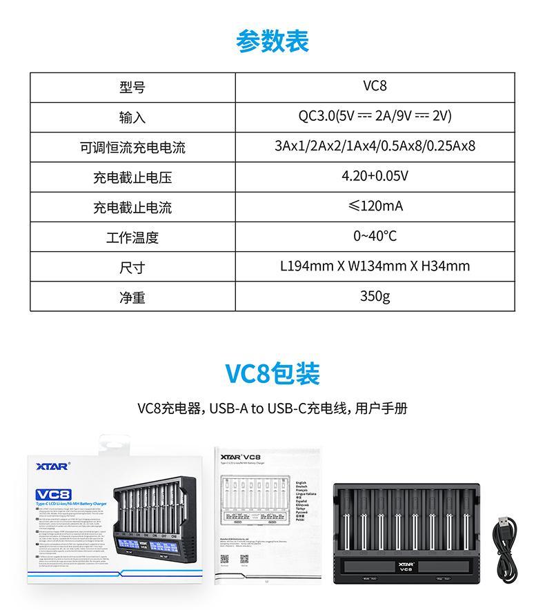 型號:VC8輸入:QC3.0(5V 2A / 9V 2A)可調恆流充電電流 3Ax1 / 2Ax2 / 1Ax4 / 0.5Ax8充電截止電壓 4.20±0.05V / 1.45±0.1V充電截止電流 ≤120mA運行溫度 0-40℃適用於:3.6V/3.7V Li-ion/IMR/INR/ICR鋰電池10440 14500 14650 16340 17500 17670 18350 18490 18500 18650 18700 20700 21700 22650 25500 266501.2V鎳鎘/鎳氫電池 AAAA / AAA / AA / A / SC / C