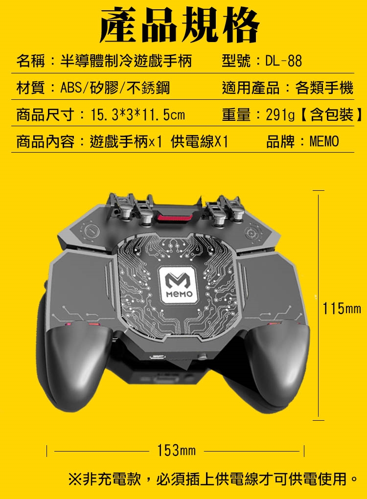 商品品牌: MEMO商品型號: DL-88商品名稱:吃雞神器半導體冰凍手機手柄適用範圍:彈簧夾裝可拉伸7-9.5公分(通用大部分手機)商品材質:ABS/不鏽鋼/矽膠/電路鋁板產品尺寸:15.3x4x11.5cm包裝尺寸:17x5x12.5cm產品重量:291g(含包裝)供電方式: USB插電使用(非充電)