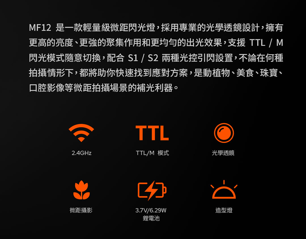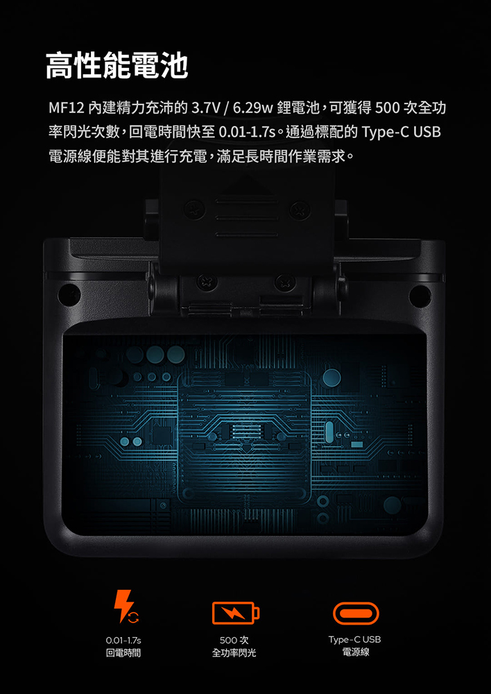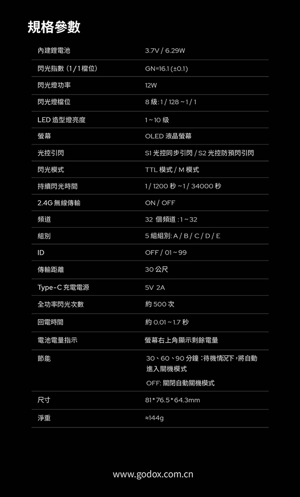 .8級可調出力:1/128~1.內建鋰電池,滿電全功率閃光約500次.支援神牛2.4g無線系統,控光更自由.標配濾色片及濾片夾.回電時間 0.01~1.7秒.USB Type-C充電口