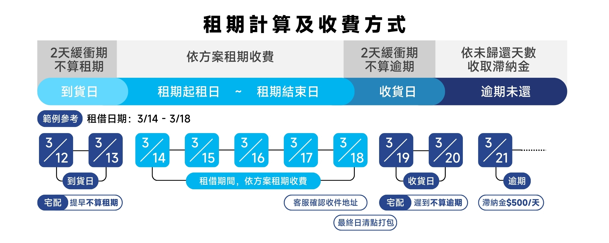 1. [單次型方案] 以7天方案為例,商品依物流配送到達後隔天為起租日,起租日+7天為歸還日。