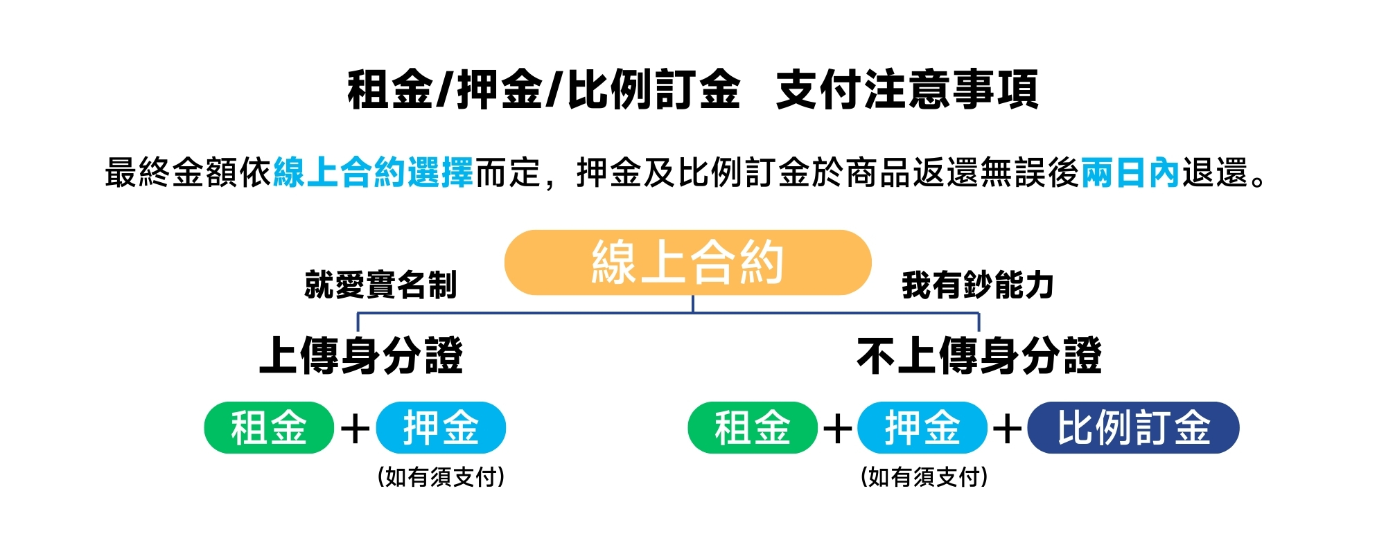 1. 需含 租金+押金。部分商品無須押金,商品返還無誤,兩個工作天內退刷押金。