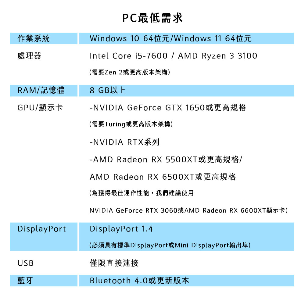 ※如同所有PC遊戲技術,效能可能會因PC設定而有所不同,包括系統相容性和DisplayPort 1.4連接線的品質。請確保你的設定符合最低需求。SteamVR遊戲也有各自的系統需求,請參閱Steam上的遊戲資訊。