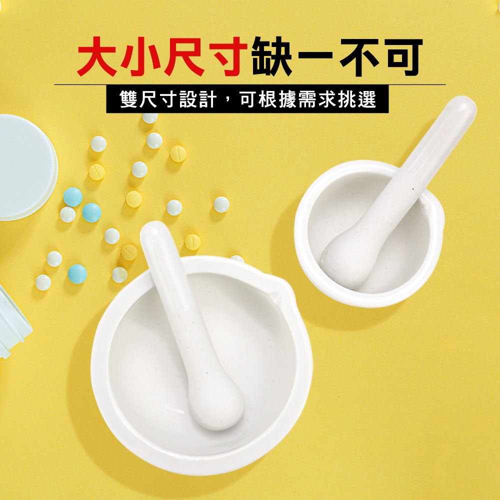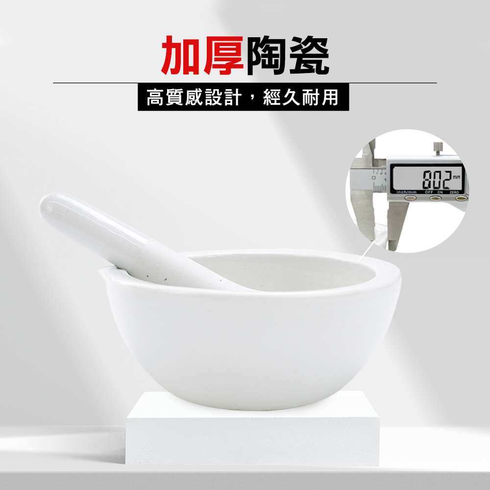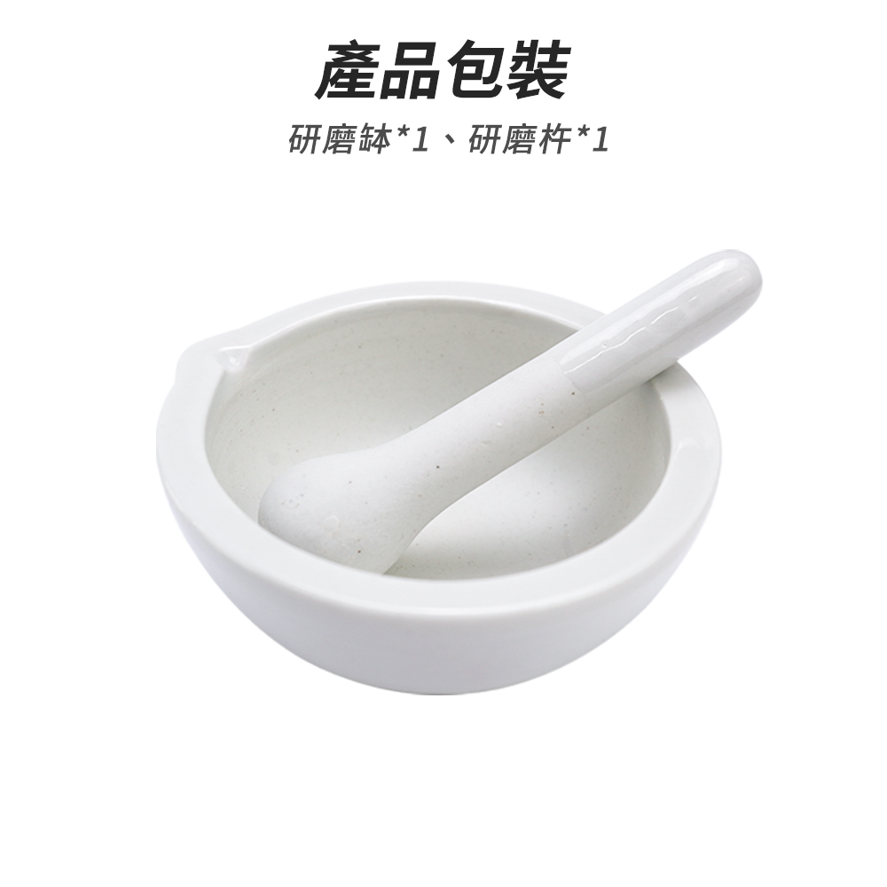 陶瓷研磨缽是實驗中研碎實驗器材的容器。產品配有缽杵,也能用於搗碎各項食材、堅果、水果辛香料等,並於缽內進行粉末狀固體混合,也能方便嬰兒入口。