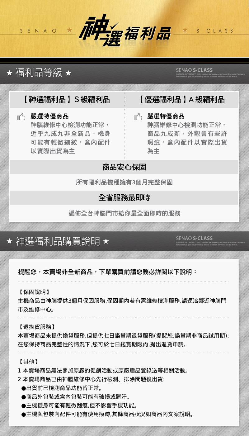 ★優選福利品 S級福利品:神腦維修中心檢測功能正常,商品近乎九成九非全新品,機身可能有輕微細紋,盒內配件以實際出貨為主★