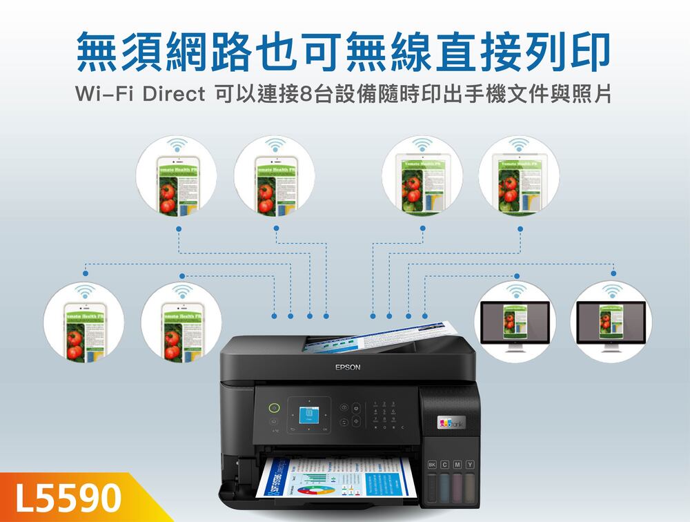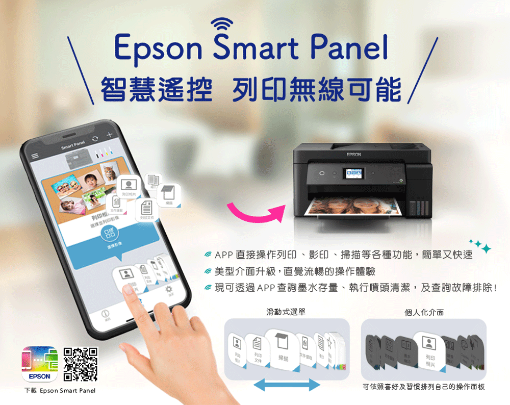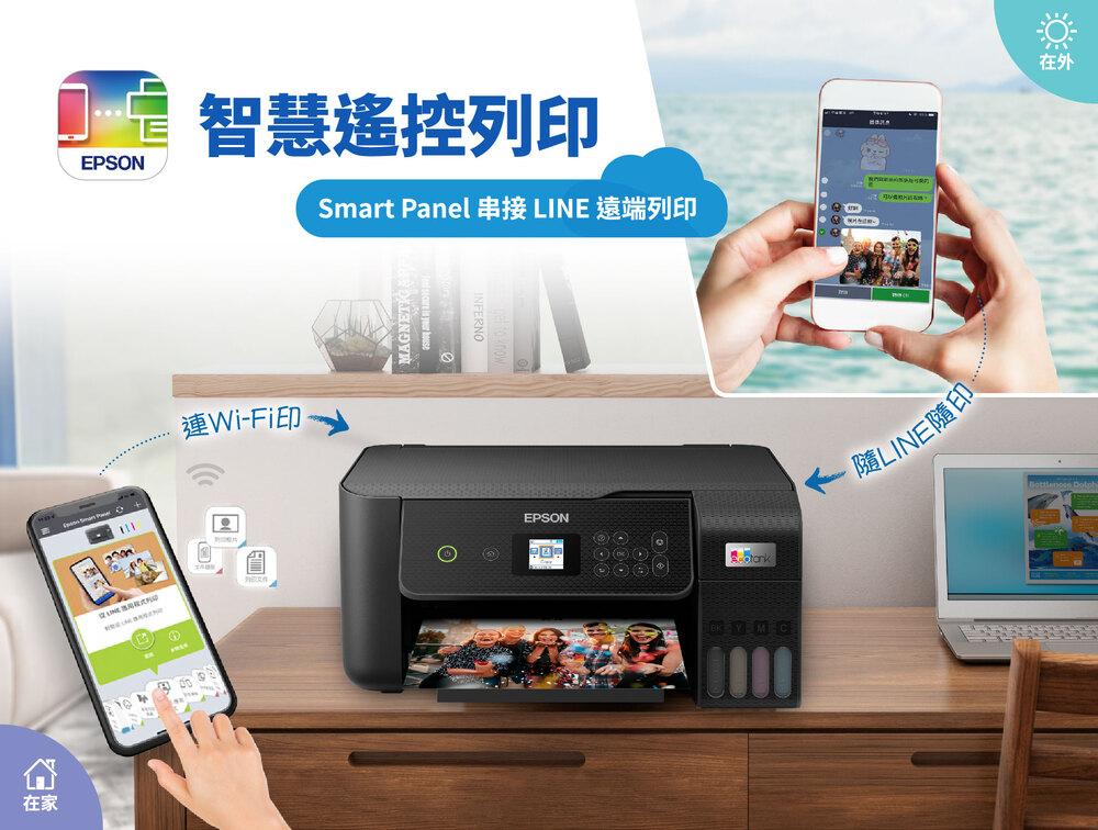 ‧支援Epson Smart Panel 智慧遙控App,可透過手機完成Wi-Fi設定、初始導墨、列印、掃描等功能,還可以執行清潔噴頭、串接LINE列印設定