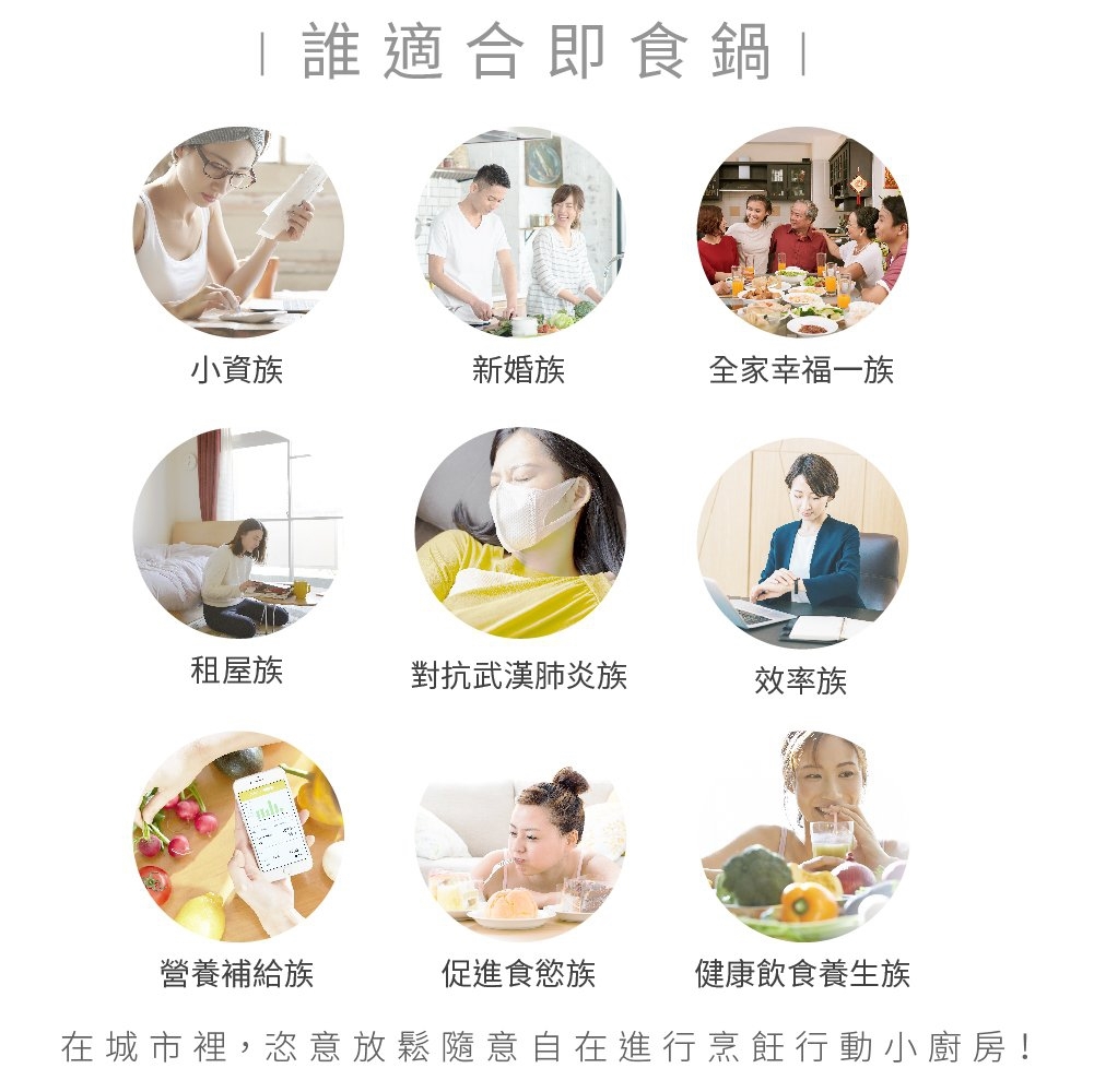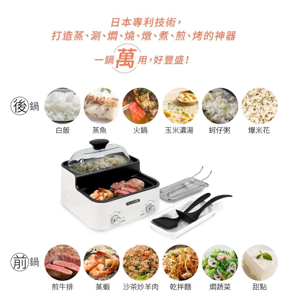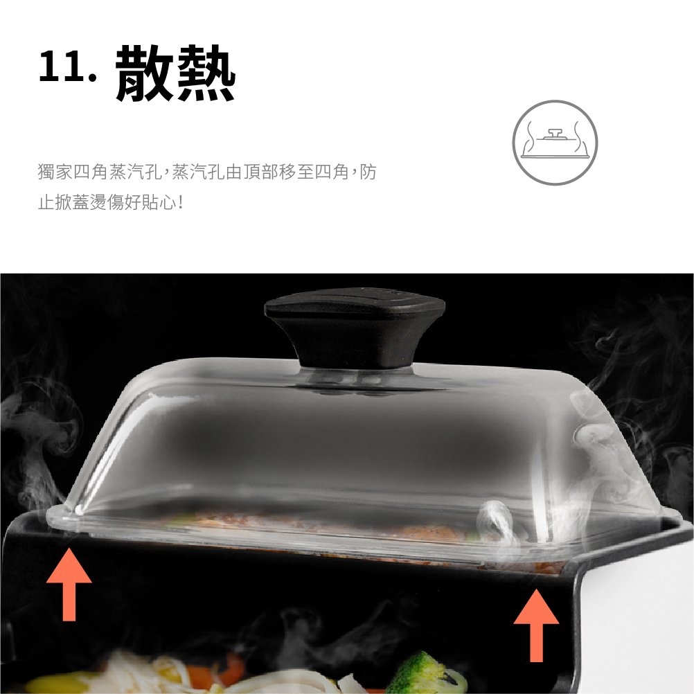 史上最高顏值、多功能即食鍋!1. 128張專利,首創鍋爐一體,同步完成多項料理2. A4尺寸精巧使用,隨處任煮好自在3.日本大金不沾塗層,易煮好清,真輕鬆4.電木彩色外殼,防燙耐熱不導電,使用好安全5.鍋緣加高設計,烹煮不油濺,安全又清潔6.挑高玻璃鍋蓋設計,蒸煮食物無油煙7.恆溫控制、超溫斷電,安心使用8.分離式電源線設計,清洗無負擔,輕鬆好收納9.底盤隱藏把手,輕鬆移動又美觀10.全機可水洗,您最煩惱的部分,我們已經設想好了11.鍋蓋四角散熱設計,易掀不燙傷
