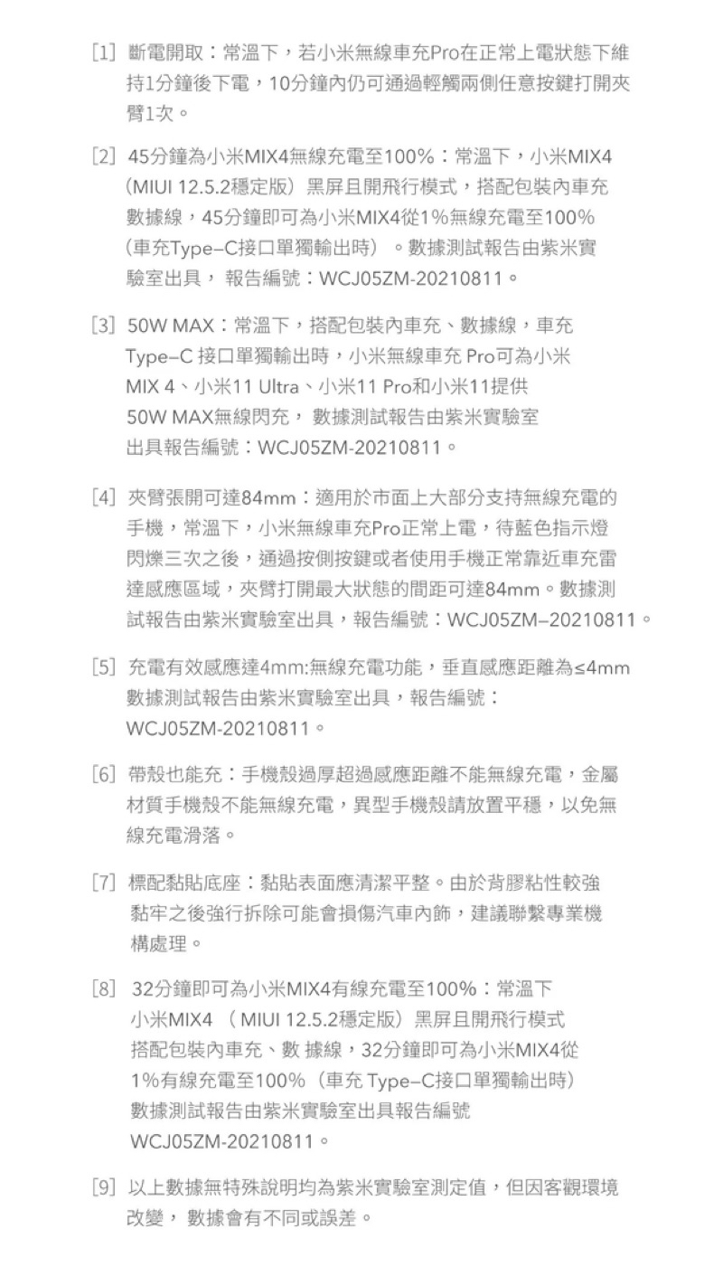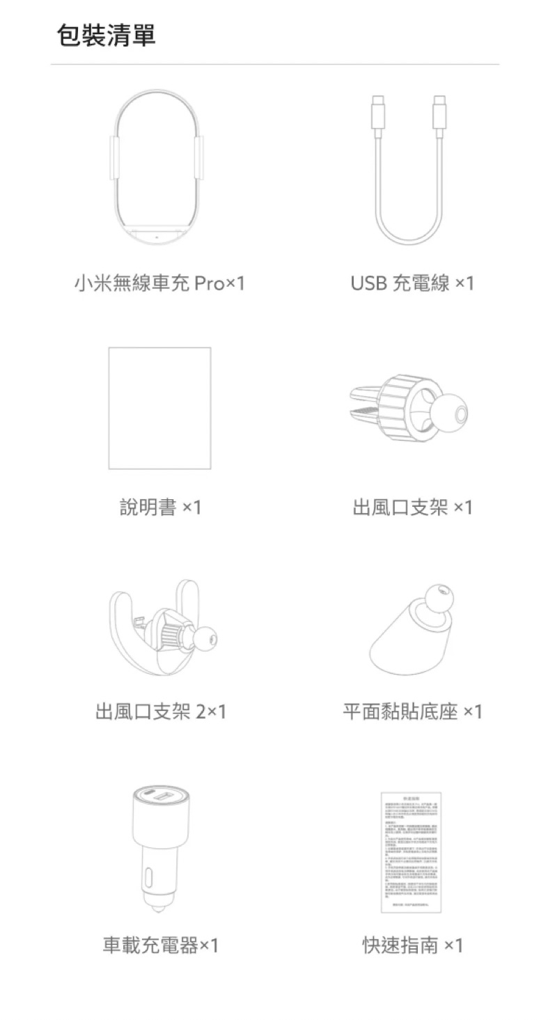 📦 小米無線車充Pro*1、電源線*1、電源適配器*1、黏貼底座*1、出風口支架*2、說明書*1、快速指南*1