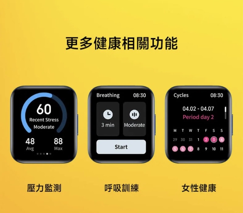健康與生活:心率檢測(註1) *,睡眠監測,指導呼吸練習,通知,天氣,時鐘,鬧鐘,手電筒,音樂控制