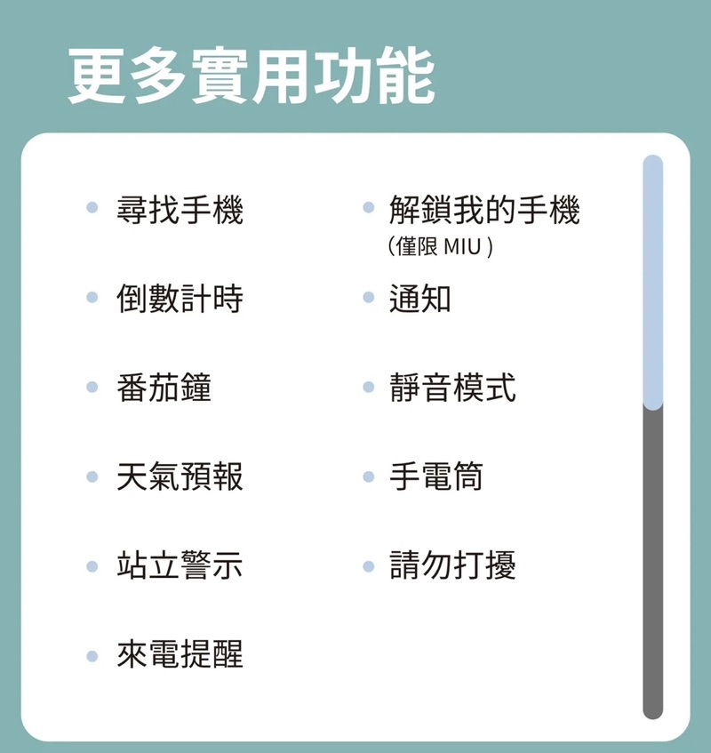 手錶功能:時間顯示, 心率偵測, 通知, 計步器, 睡眠監控