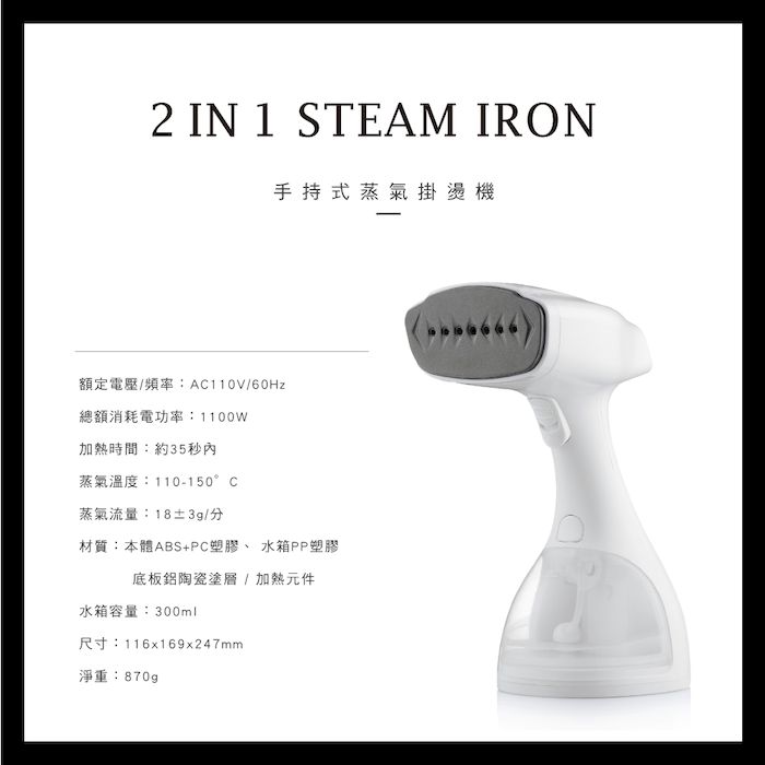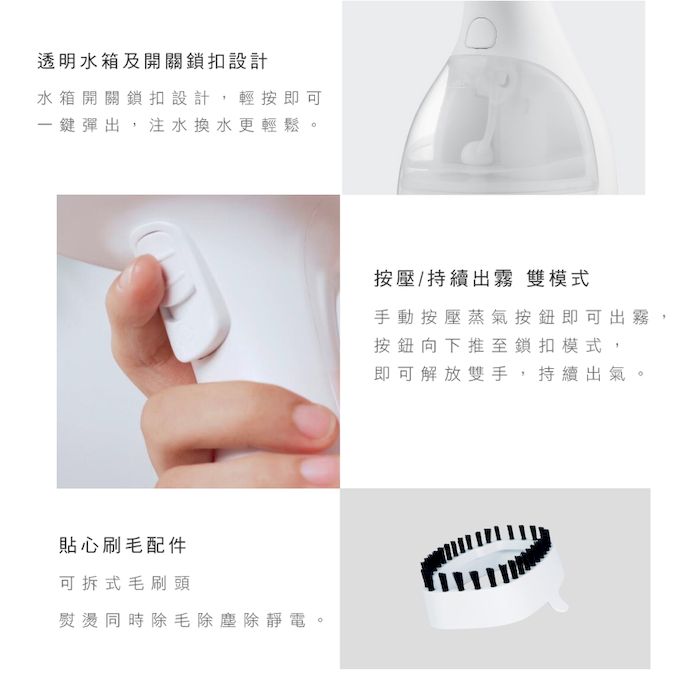 兩用:手持式掛燙、熨斗平燙(贈品:可拆式毛刷頭)