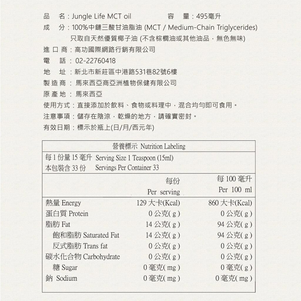 每份 15 克中鏈甘油三酯(癸酸和辛酸)、人體將其用於產生能量