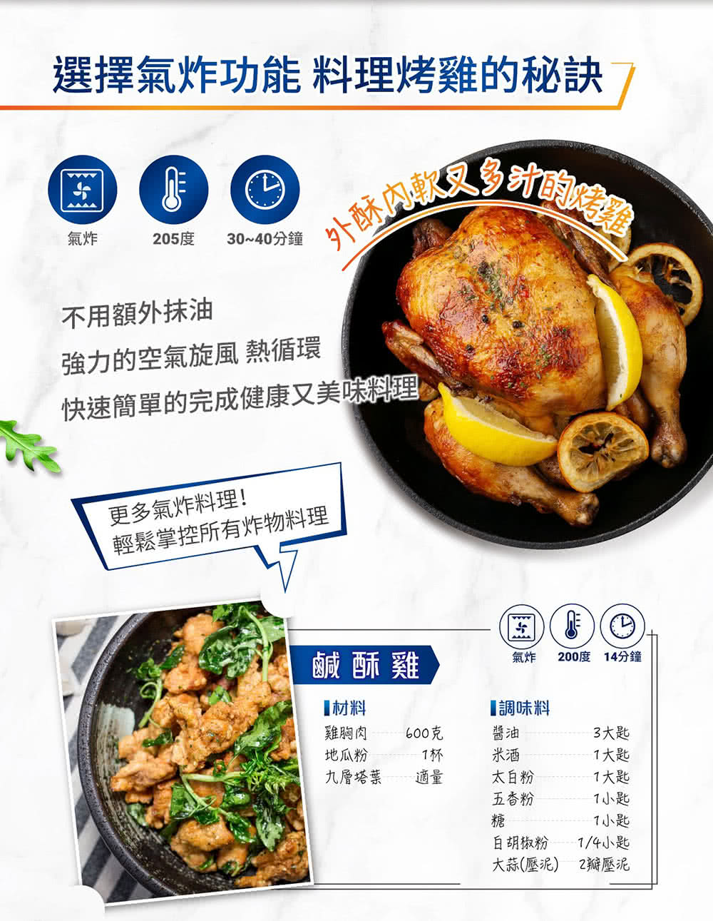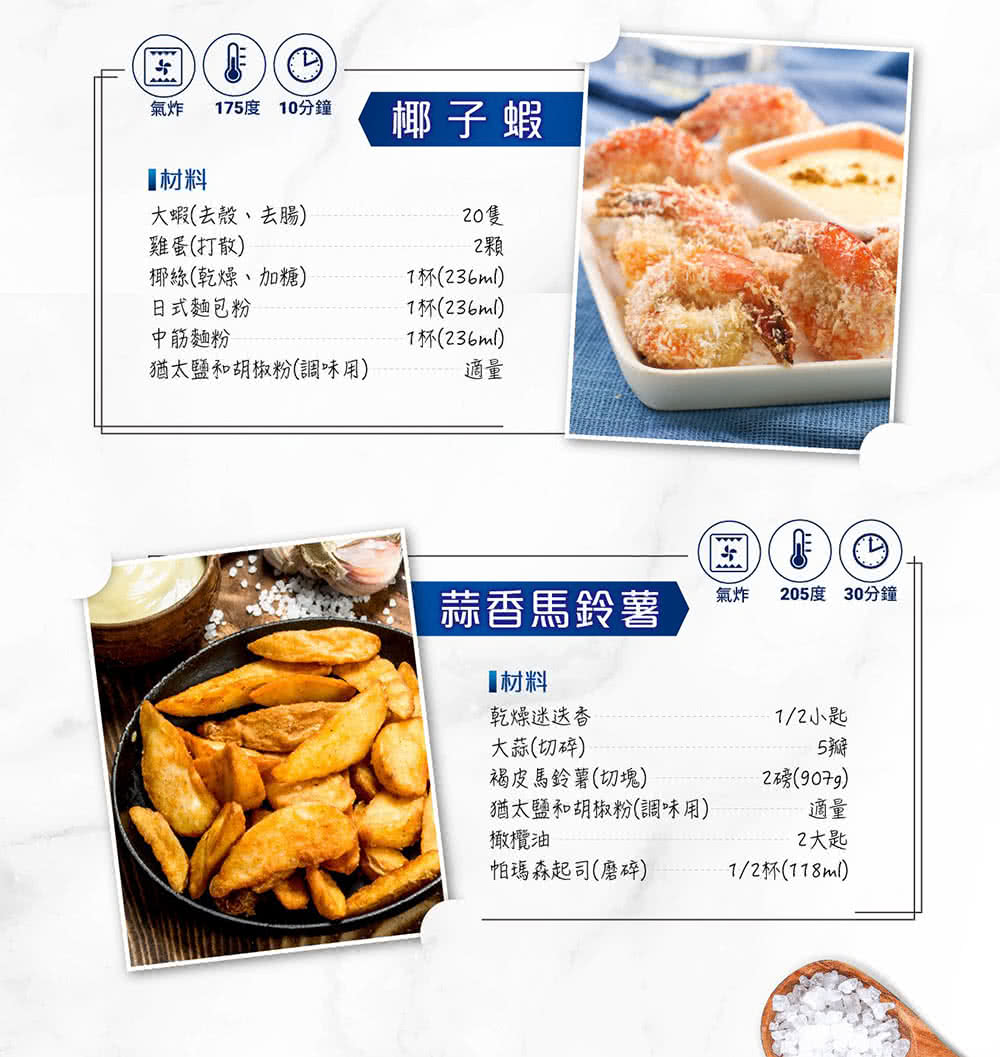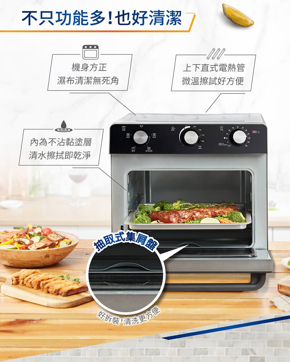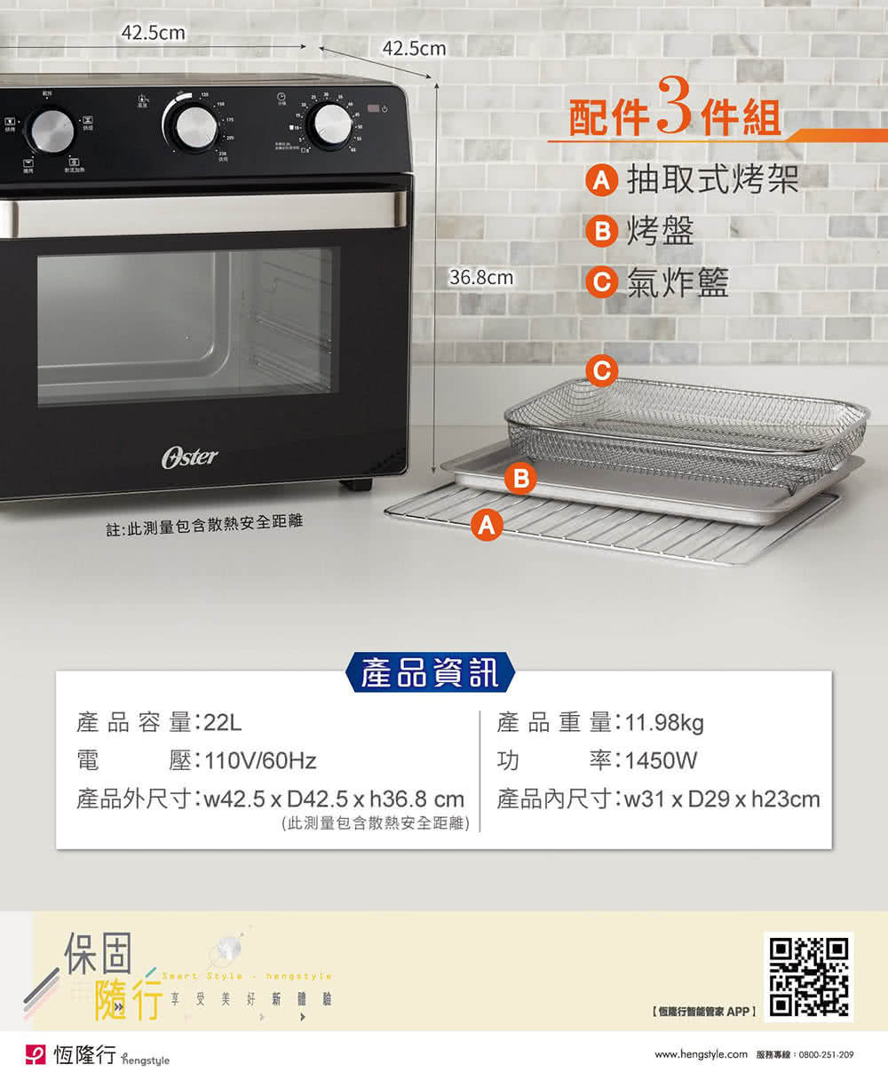 內容物:保證書、中文說明書、氣炸籃、烤盤、抽取式烤架、可拆式集屑盤