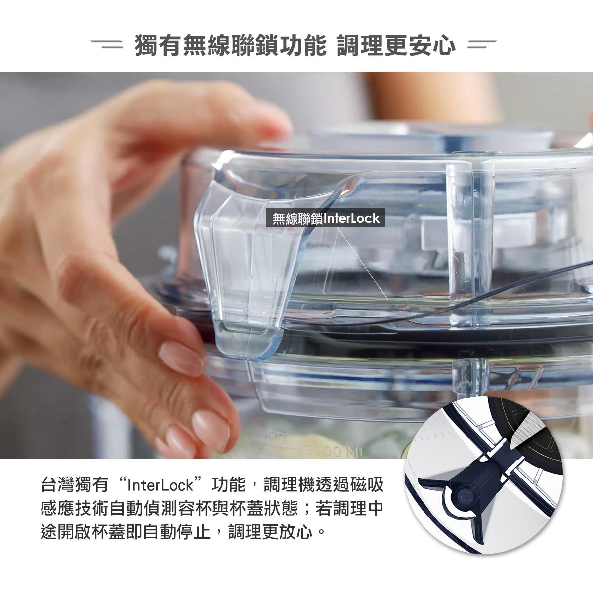 ★智能保護偵測技術,無線連接鎖定杯蓋,當容杯未鎖緊時,無法運轉。若運轉未停前打開杯蓋,調理機立即自動停止運轉