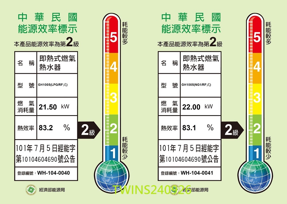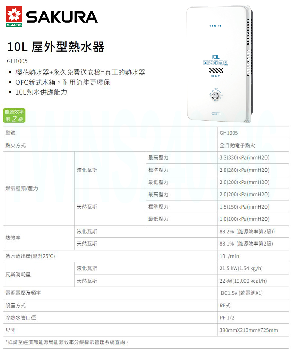 ●型號:GH-1005 ●安裝適用環境:屋外式自然排氣 ●點火方式:全自動電子點火 ●設置方式:RF式 ●冷熱水管口徑:PF 1/2 ◎尺寸:390mmX210mmX725mm ●機體重量(kg):14 ●熱效率:液化瓦斯83.2% (能源效率第2級))/天然瓦斯83.1% (能源效率第2級) ●熱水放出量(溫升25℃):10L/min ●電源電壓及頻率:DC1.5V (乾電池X1) ●BSMI:R51085