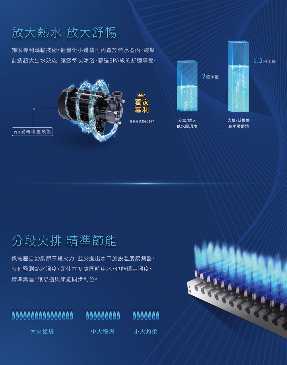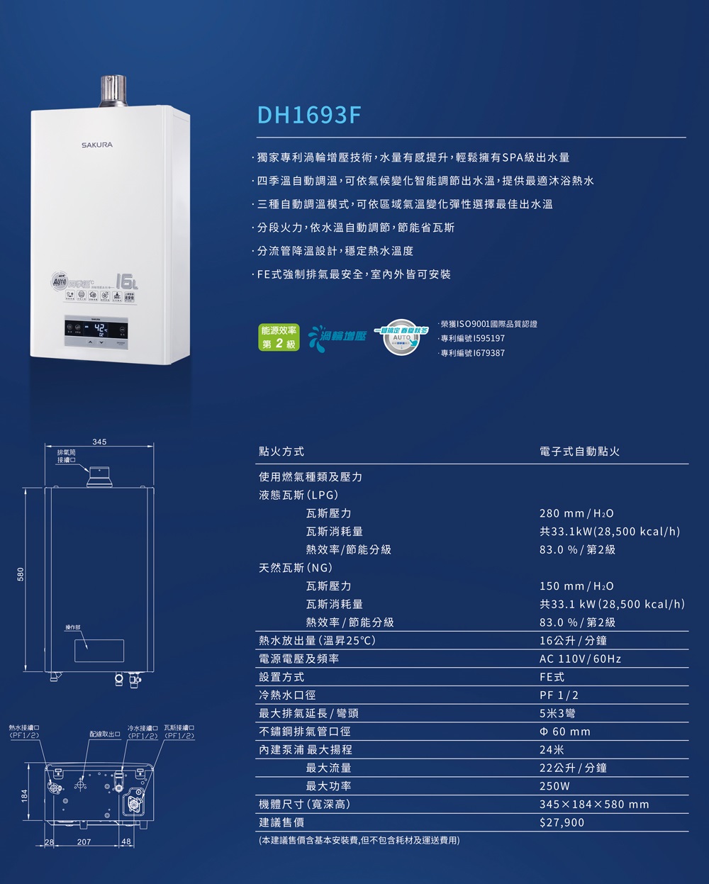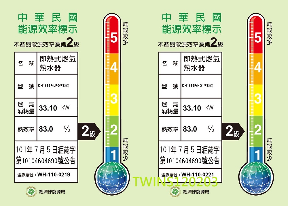 ●型號:DH-1693F ●點火方式:全自動電子點火 ●燃氣種類/壓力 ○液化瓦斯 最高壓力:3.3(330)kPa(mmH2O) 標準壓力:2.8(280)kPa(mmH2O) 最低壓力:2.0(200)kPa(mmH2O) ○天然瓦斯 最高壓力:2.0(200)kPa(mmH2O) 標準壓力:1.5(150)kPa(mmH2O) 最低壓力:1.0(100)kPa(mmH2O) ●熱效率 ○液化瓦斯:83.0%(能源效率第2級) ○天然瓦斯:83.0%(能源效率第2級) ●熱水放出量(溫升25℃):16L/min ●瓦斯消耗量: 液化瓦斯:33.1 kW(2.4 kg/h) 天然瓦斯:33.1kW(28,500 kcal/h) ●電源電壓及頻率:AC110V / 60Hz ●設置方式:FE式 ●冷熱水管口徑:PF1/2 ◎尺寸:345mmX184mmX580mm ●機體重量:19kg ●BSMI:R51085