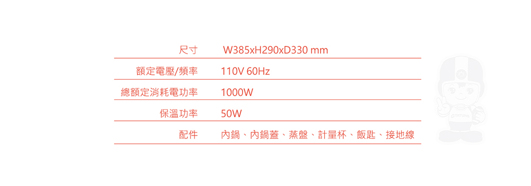 配件:內鍋蓋、蒸盤、量米杯、飯匙