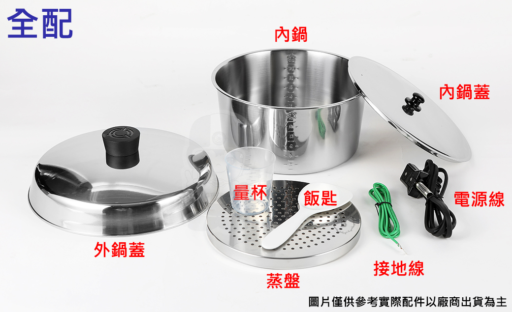 ◎除外鍋為鋁質,其餘全配件 外鍋蓋、內鍋蓋、內鍋、蒸盤 皆為SUS304不鏽鋼