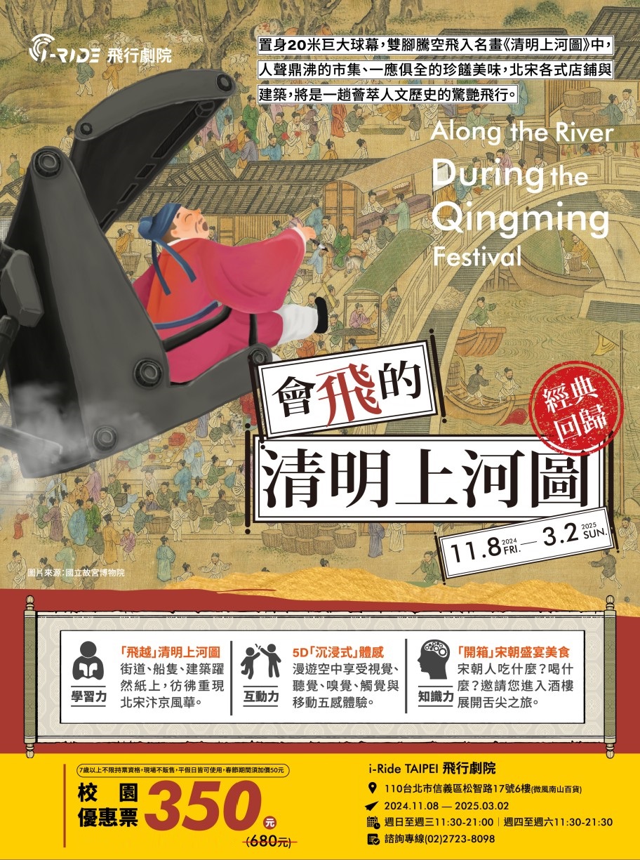 置身20米大球幕,雙腳騰空飛入名畫《清明上河圖》中,好評經典回歸!!人聲鼎沸的市集、一應俱全的珍饈美味,北宋各式店鋪與建築,將是一趟薈萃人文歷史的驚艷飛行。